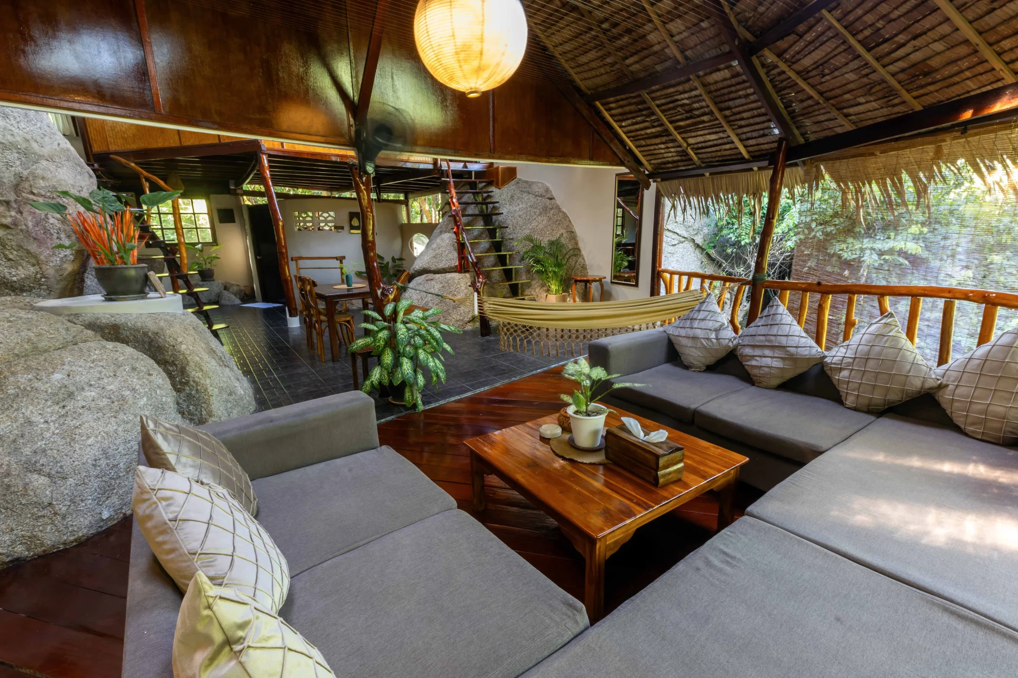 Bask in the natural light and vibrant energy of Sunshine House. Designed to uplift and rejuvenate, this room provides a bright, comfortable space to relax and reflect. Let the sun’s warmth and the jungle’s embrace enhance your personal renewal.
